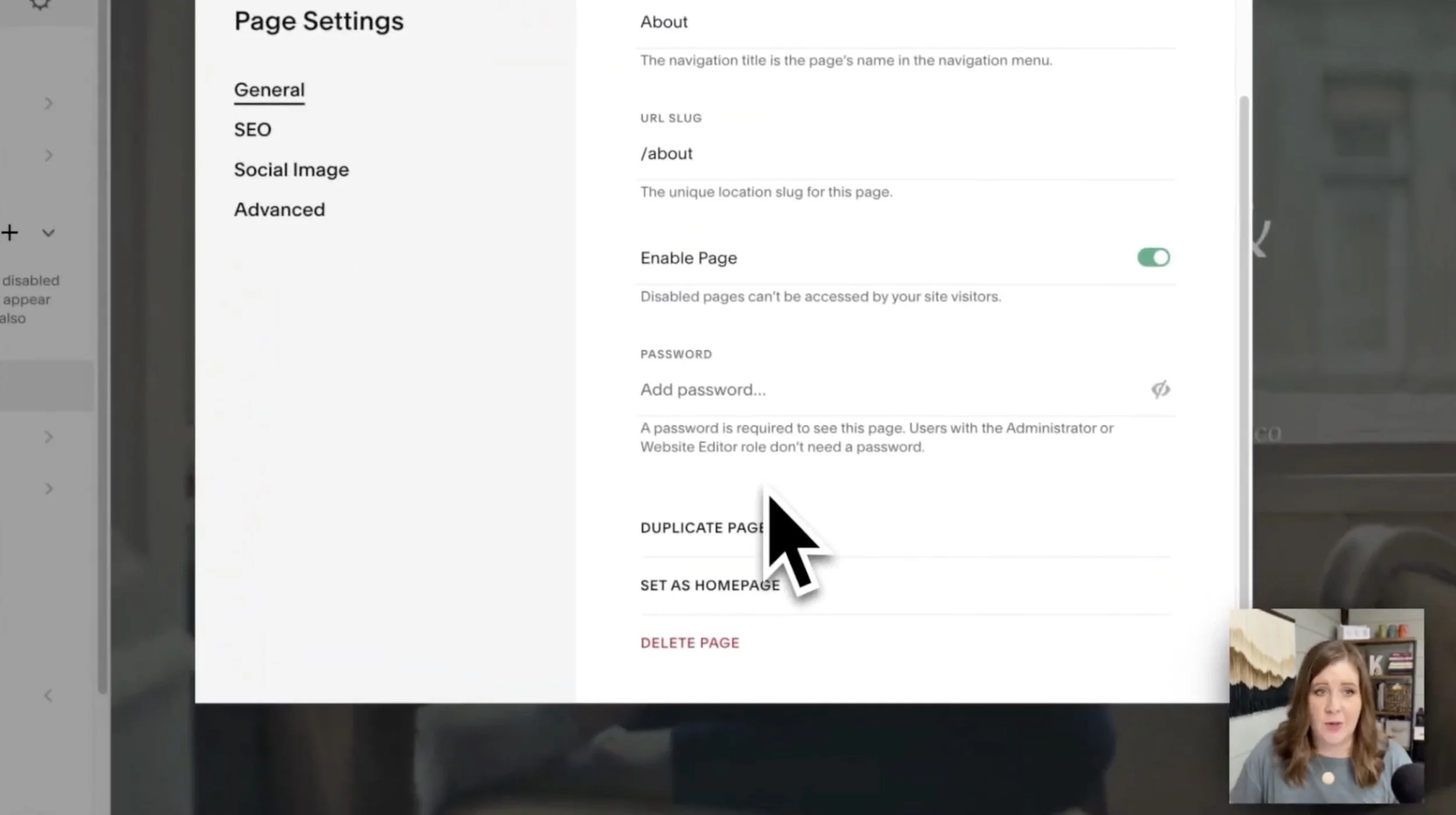 To copy a single web page, you’ll open that page’s Settings panel, scroll to the bottom of the General section, and click Duplicate Page. Squarespace will add the duplicate with the word (Copy) at the end of the title and place it in your Not Linked section, so you can tell them apart.