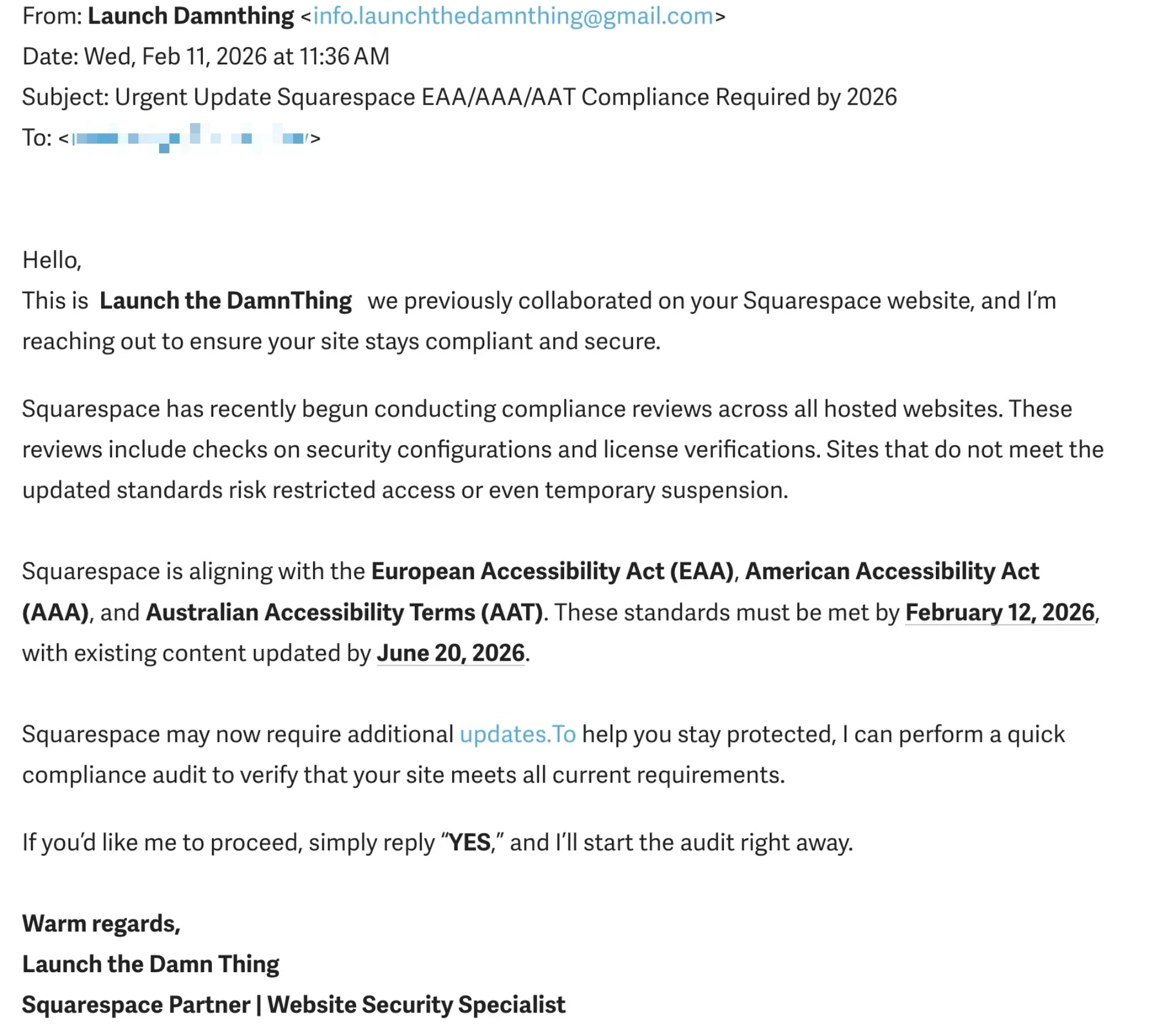 This is Launch the Damn Thing we previously collaborated on your Squarespace website, and I'm reaching out to ensure your site stays compliant and secure.