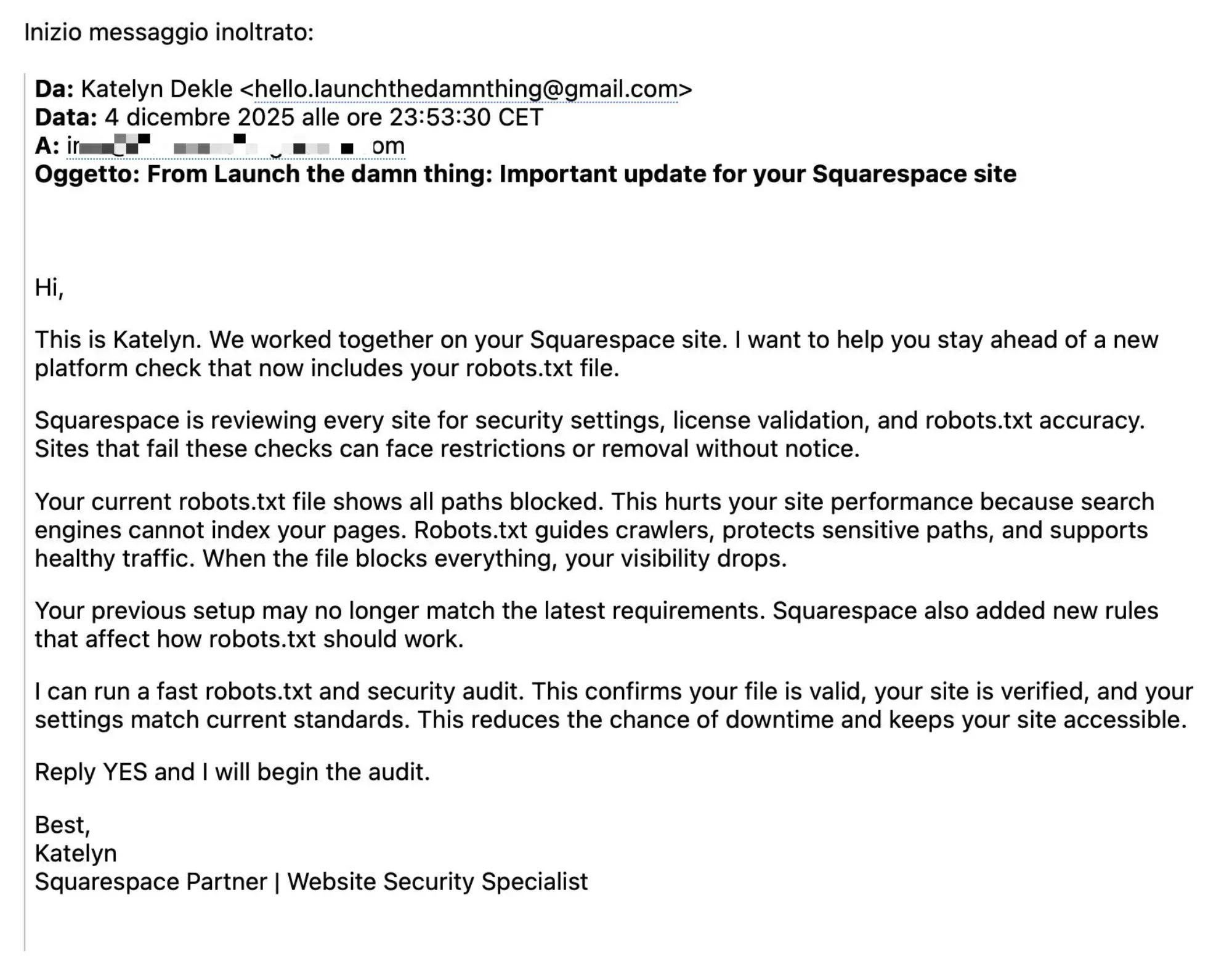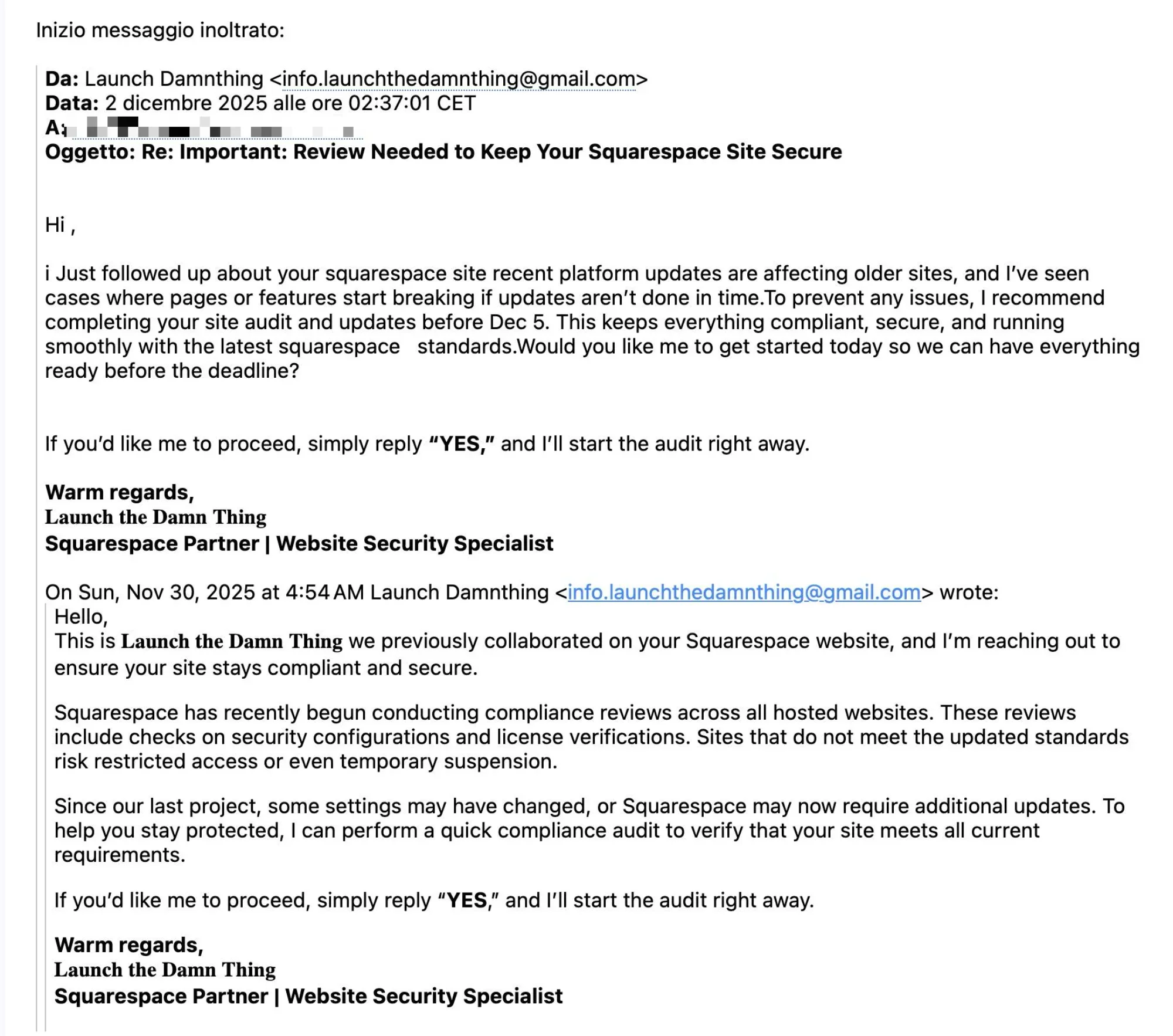 Starting in late November 2025, for me, multiple clients began forwarding me suspicious emails that appeared to come from my business. These emails claimed their Squarespace websites needed urgent "compliance audits," "security reviews," or updates to meet new accessibility standards.