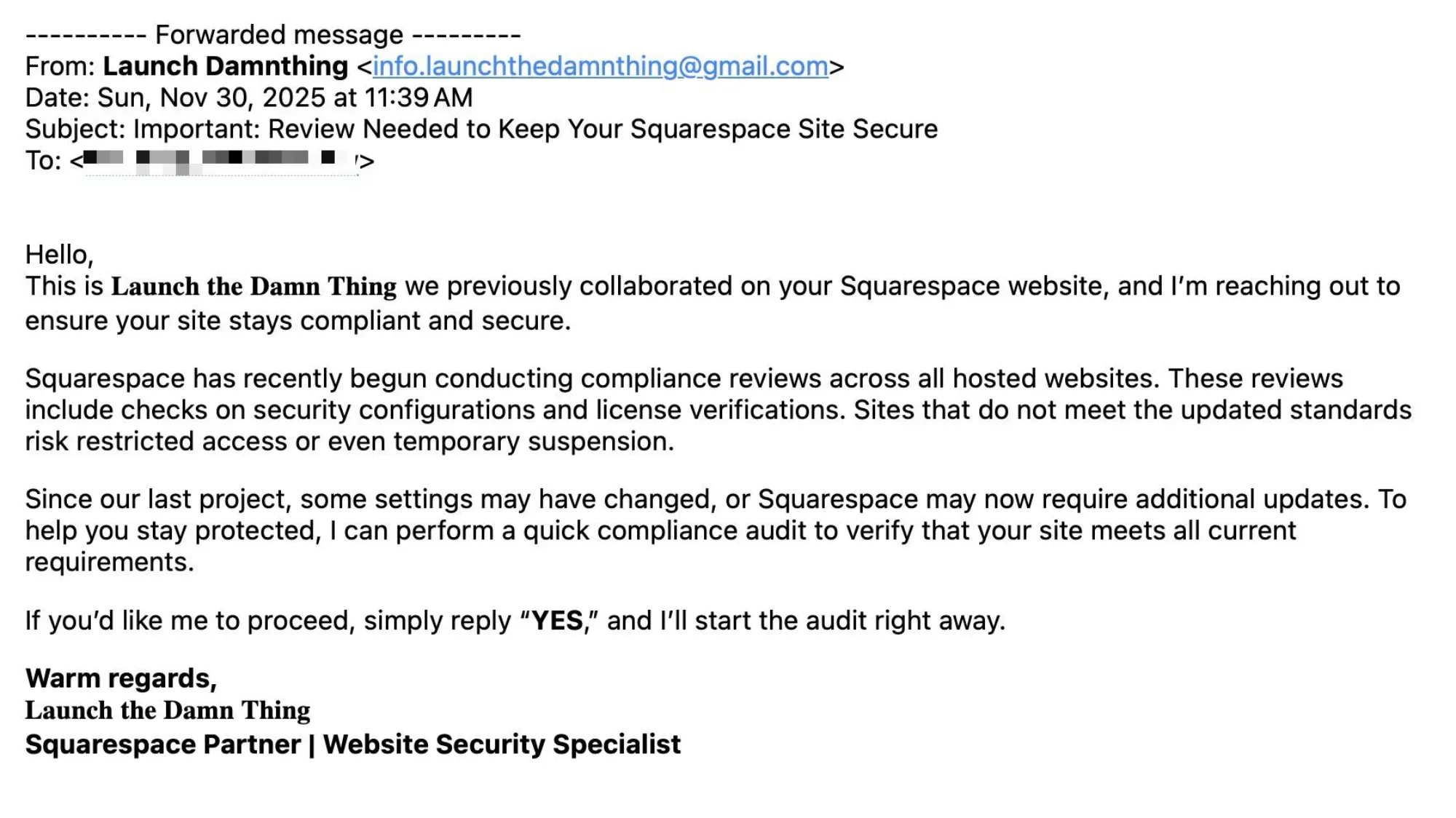 This is Launch the DamnThing we previously collaborated on your Squarespace website, and I'm reaching out to ensure your site stays compliant and secure.