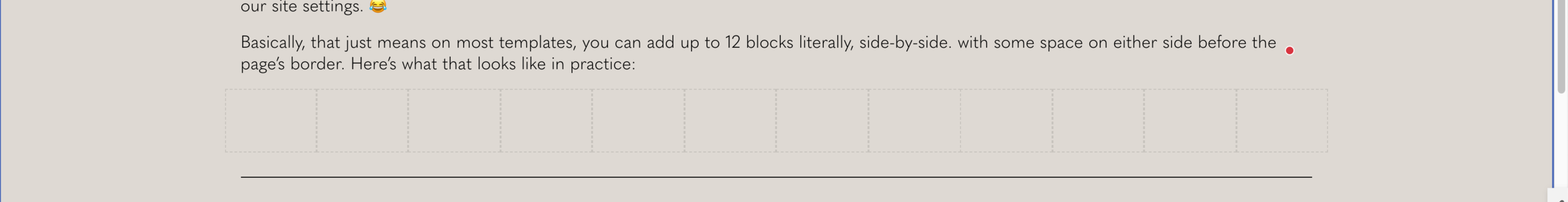 Squarespace’s Classic Editor (in v7.0 and older versions of 7.1) is set up on a 12 block grid. Basically, that just means on most templates, you can add up to 12 blocks literally, side-by-side. with some space on either side before the page’s border. Here’s what that looks like in practice: