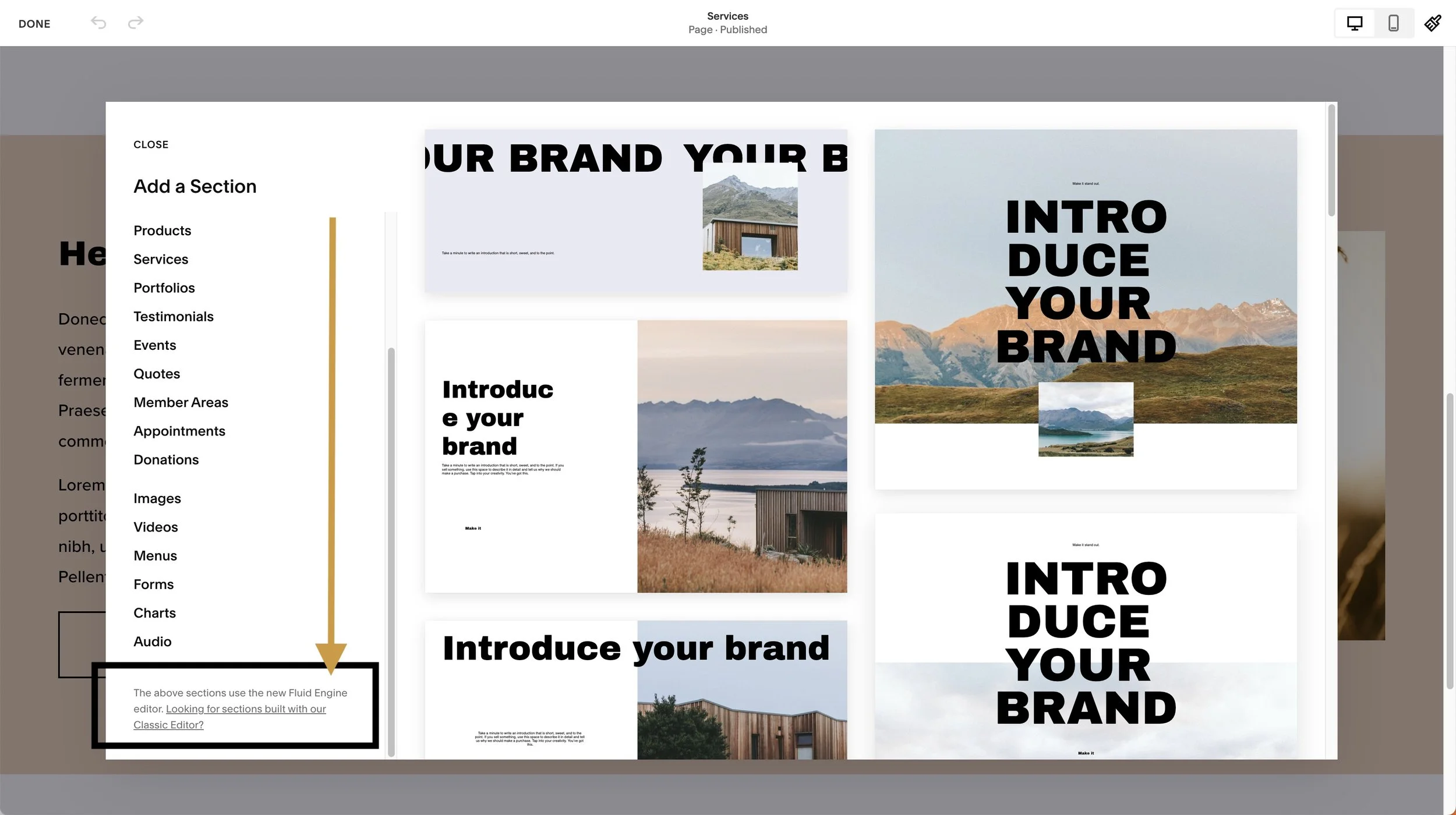 ⚠️ I don’t know whether/if any of these will be changing over to Fluid in time, but for now, Squarespace has told us that these page and section types will remain in their current editors & will not be using FE.