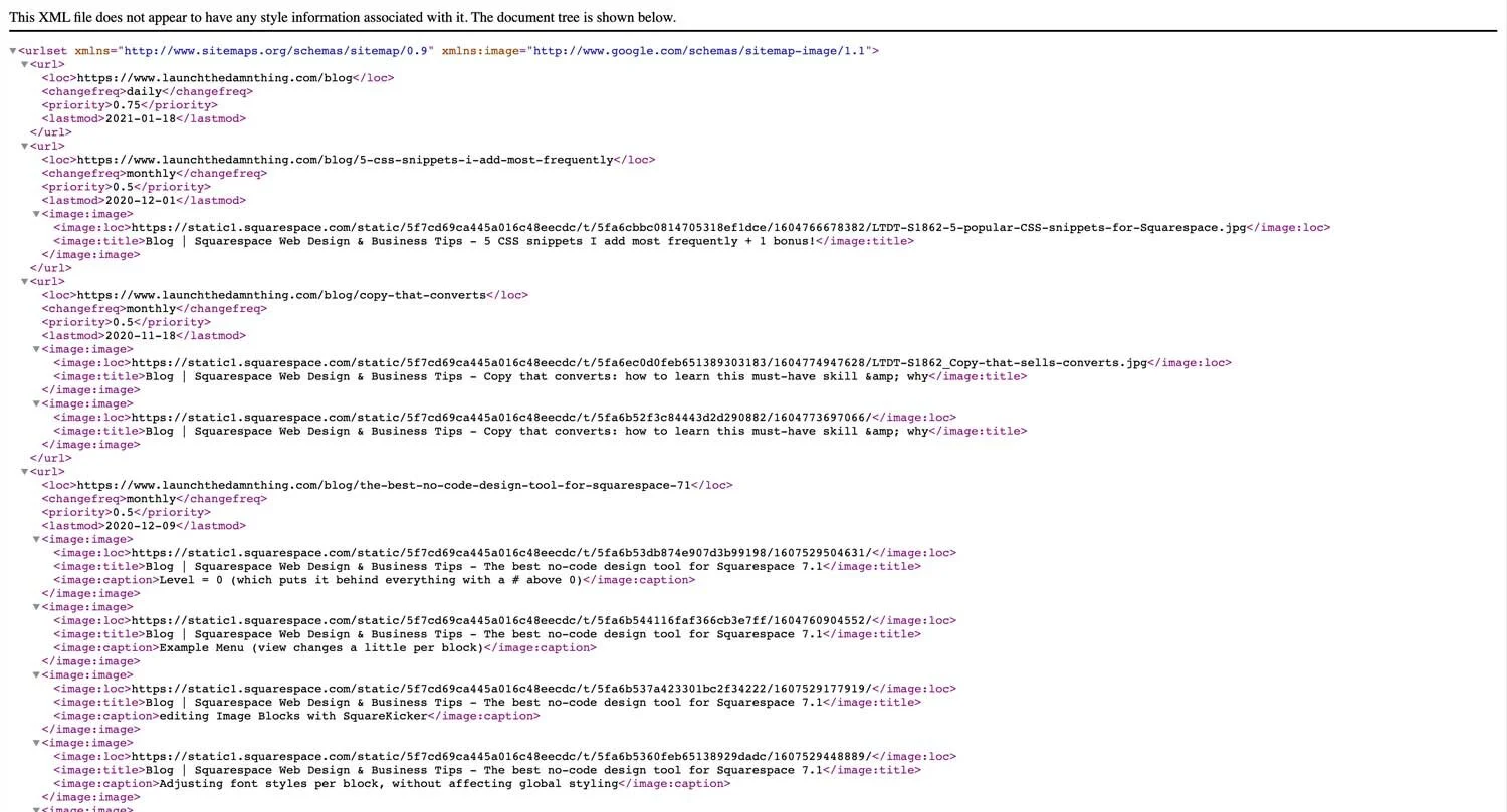 Luckily for Squarespace users, they create a sitemap for every website built on their platform, automatically. You can access it or link to it from your footer by including a link to your website URL by adding /sitemap.xml at the end.