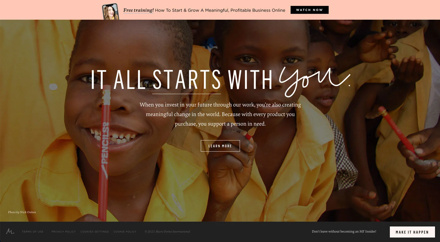 On Marie Forleo’s site however, once you scroll to the bottom, there’s a call-to-action above her footer and in her footer, but no navigation down there whatsoever, besides her links to privacy, terms and cookies, etc.