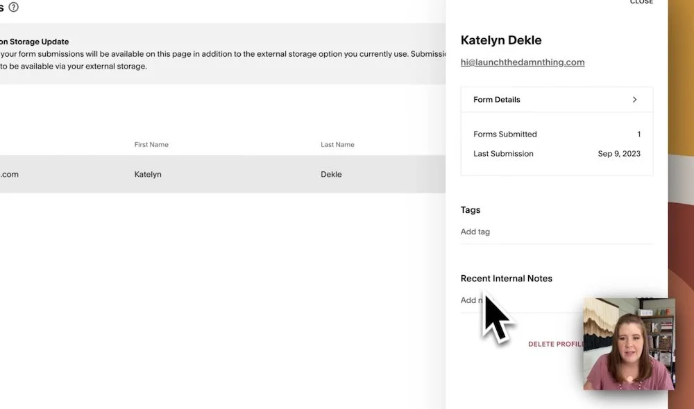 If you click on your entries here in this list, you can see the form submitter’s contact details, you can add tags to that entry and even add internal notes from that initial detail panel. You can also look at the form details, and –here’s another new feature from Squarespace– create a project with that person from here.