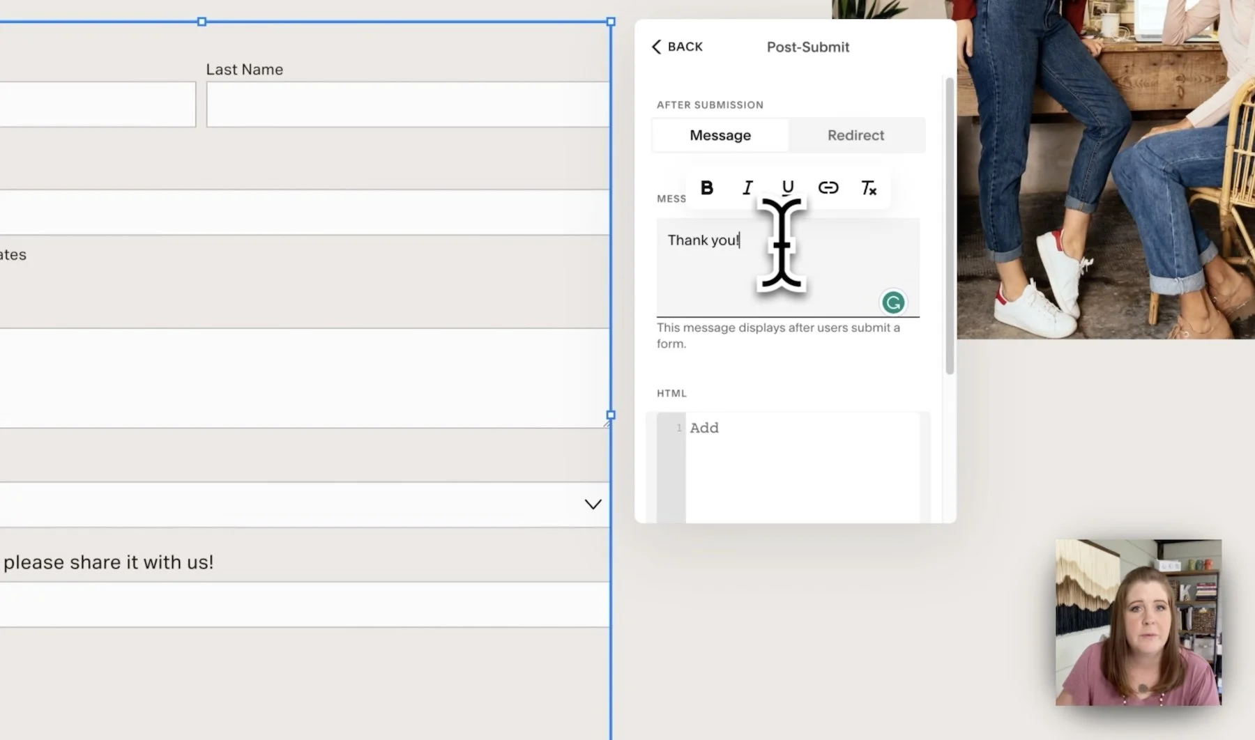 You can also redirect to a very simple thank you page (one you build in Squarespace –or anywhere, for that matter) that can be totally generic with an image of you smiling or some pretty/happy stock photo, with a text box on it that literally just says “thank you.” The action of redirecting the page after they submit the form shows the user the form has been submitted without you really having to say that it’s been successfully submitted.
