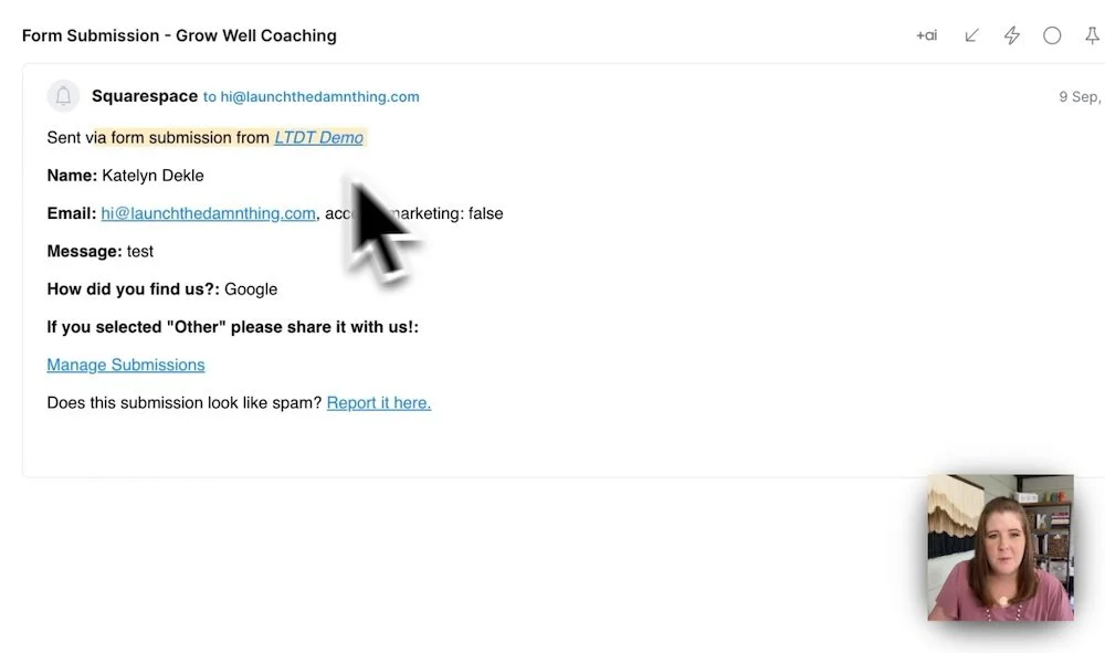 After submitting a test, now I can show you what that email submission will look like, from Squarespace.