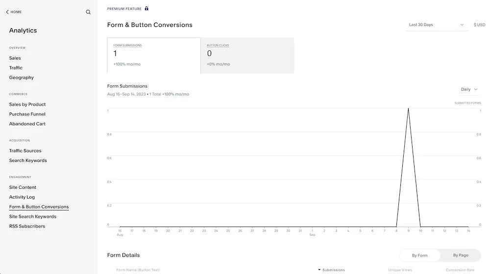 You can also see form analytics from the Analytics area of your website, in the Buttons & Conversions area.