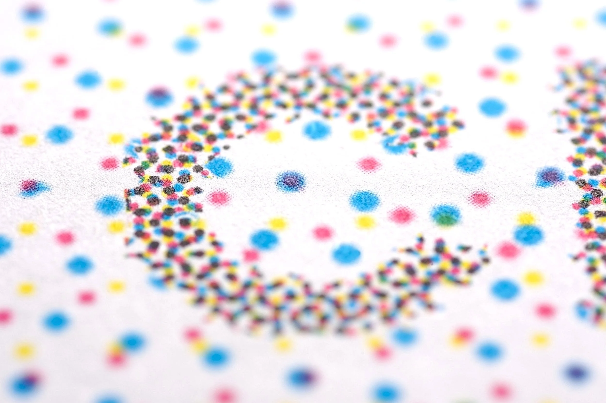 How do just 4 colors make up our printed images? They use a series of dotted patterns. Each dot being only 1 of the 4 colors, which overlap and print in varying distances from the other dots, which tricks our brains into blending & then seeing solid colors from further away. If you use a magnifying glass to look closely at a printed image, you may be able to see these tiny dots for yourself, but here’s an example you won’t need a magnifying glass for: