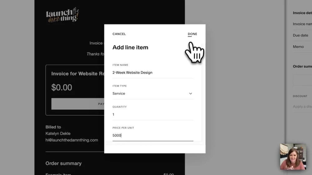 To adjust the order summary, you can add line items with basic descriptors & prices. For example, Two-week Website Design is the line item service I’ll be providing in this demo, and it will cost $5,000. Click Done and add more line items if you want, such as a Basic Branding package for $1,500.