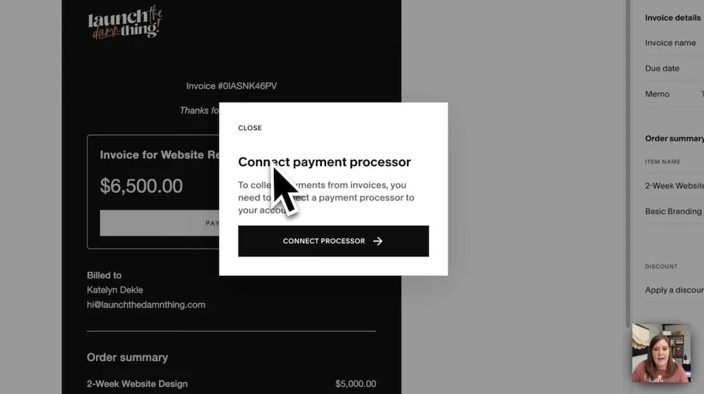 If it prompts you to connect a processor though, it'll take you to that area in settings from a different browser tab, so you won’t lose your progress or your place in the invoice process.