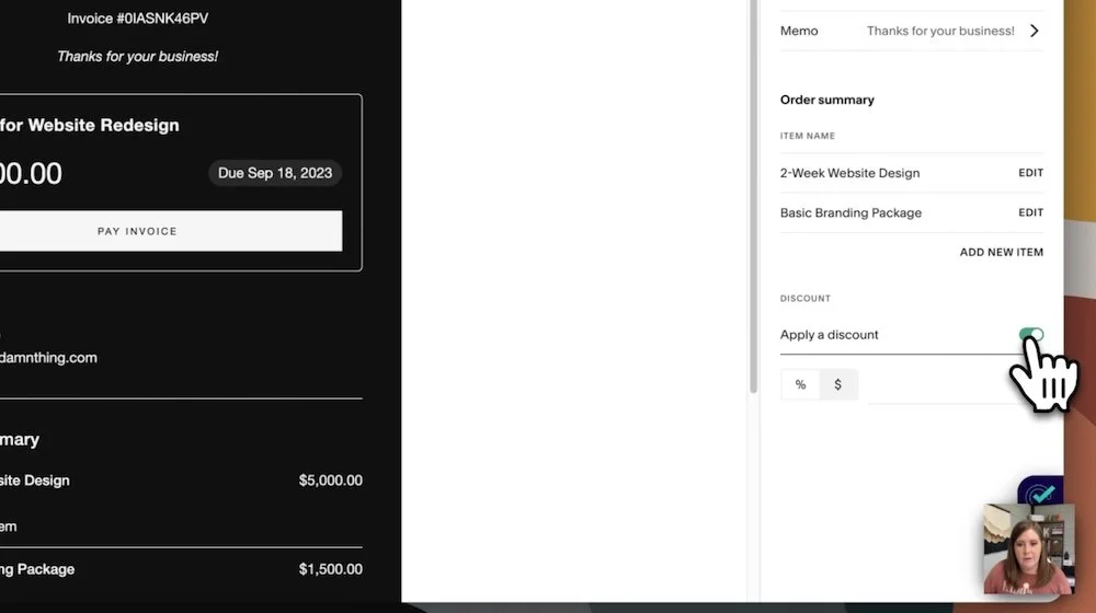 Next you can choose to add a discount in either a percentage or a flat-fee dollar value. I rarely discount my services, so for this demo, I won’t be using that.