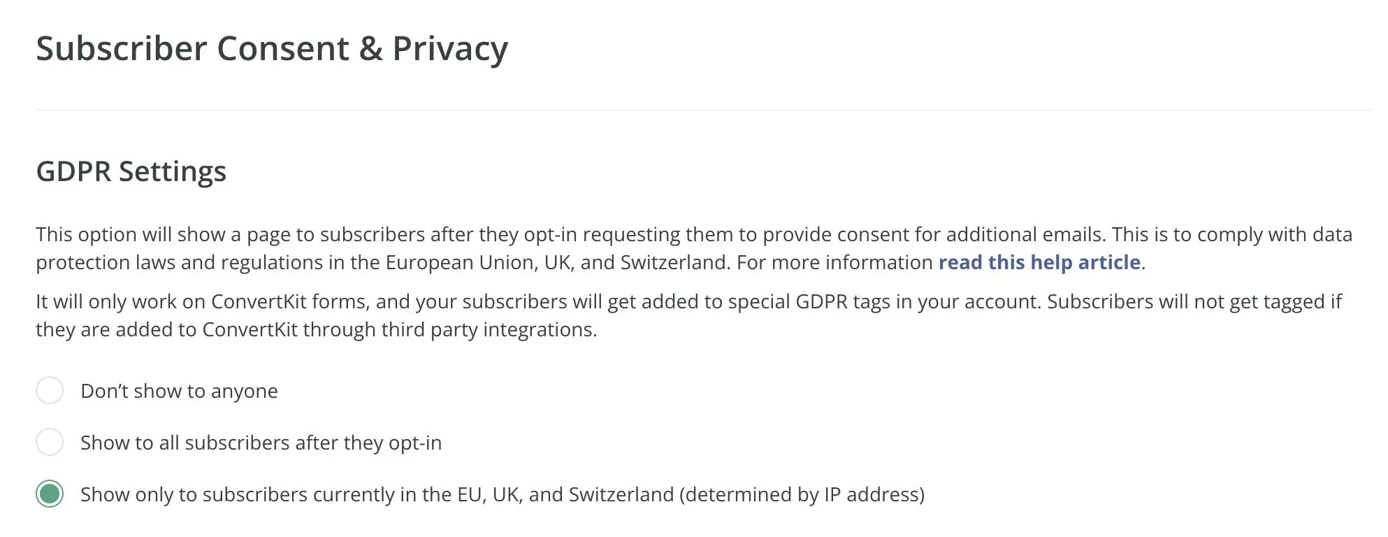 Related to GDPR, ConvertKit also has special account settings that allow us to decide who sees those form options & when.