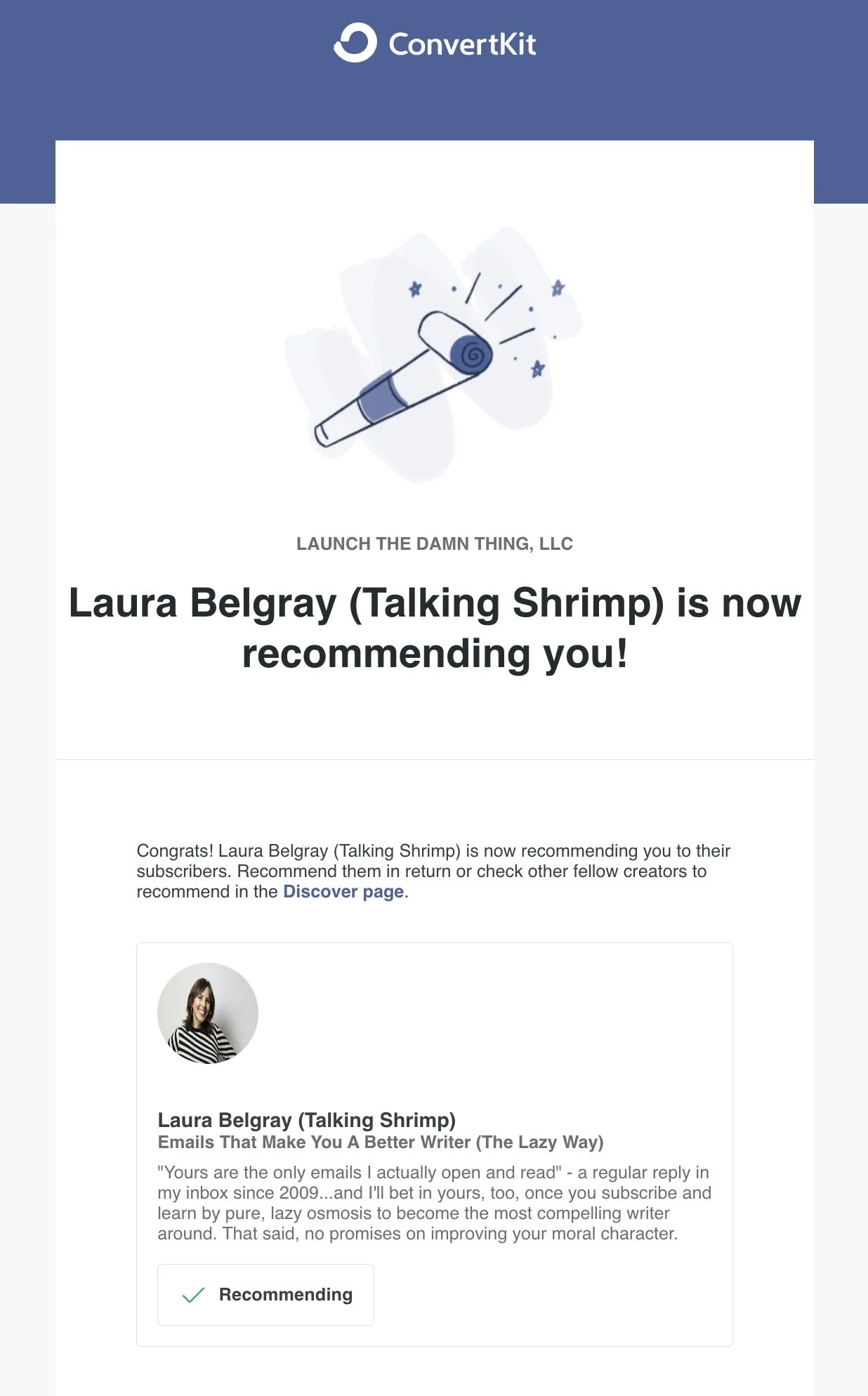 screenshot of ConvertKit's notification that Laura Belgray is now recommending my newsletters to her audience
