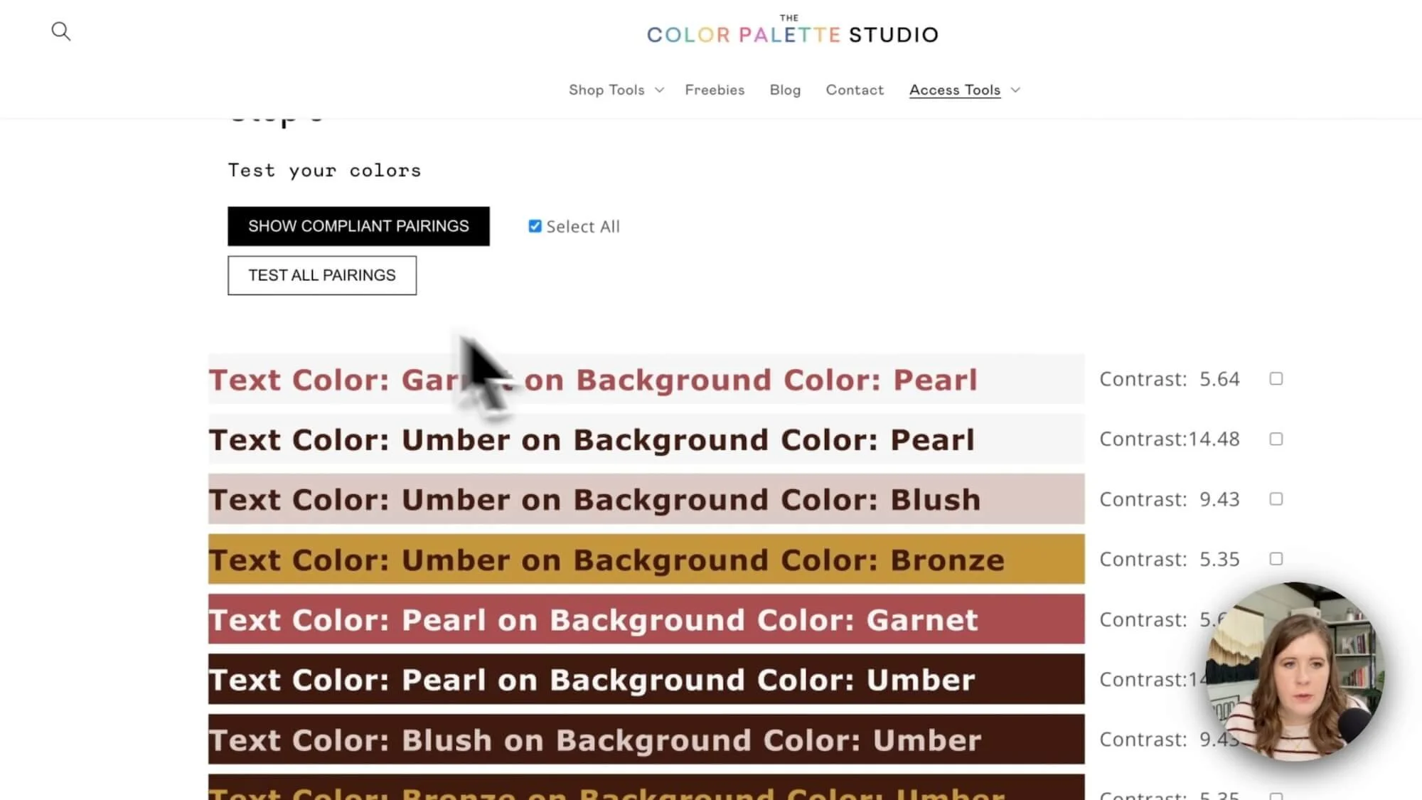 To ensure your colors are accessible, the tool can show ALL color pairings or only the compliant pairings and their individual contrast scores in either option. Remember, higher scores (above 4.5) mean higher contrast and better accessibility compliance!Show the Palette: