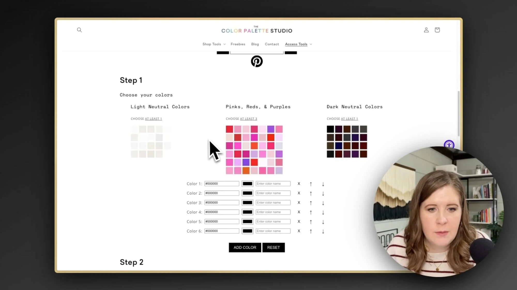If you’re NOT using the built-in colors from a moodboard, don’t click any of the colors from the 3 sections. Instead, go back to the color palette you've created in Coolors, copy the color codes and paste them into the Color Palette Builder tool, adding all the colors from YOUR Coolors palette.