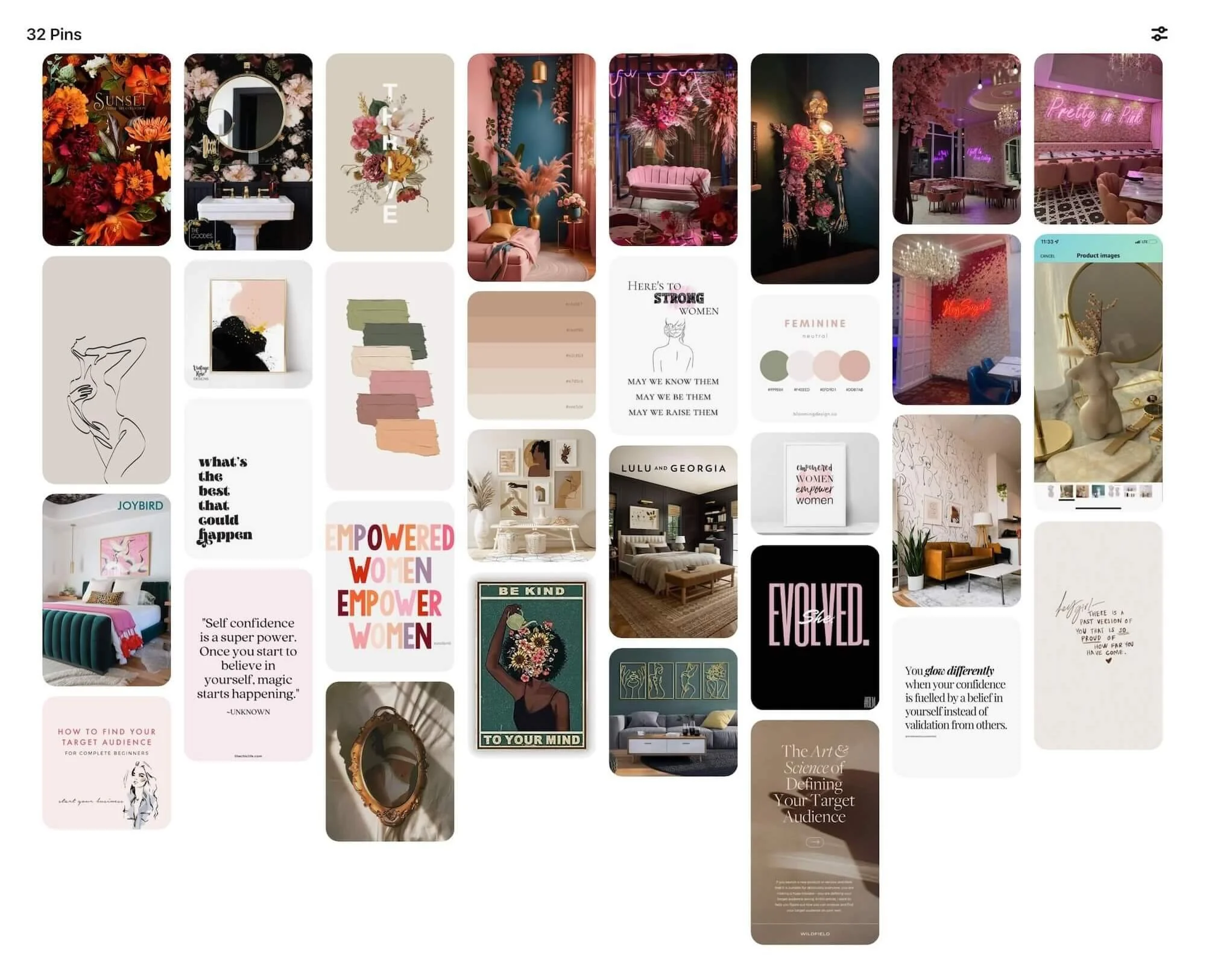 My clients create a pin board for me, filled with images that resonate with various aspects of their style and what a physical space might look like if their website had a physical lobby to invite their clients/customers into. It could be filled with anything from their favorite color combinations, to images of interiors that inspire them, font styles & color palettes they’re drawn to, quotes, and more.