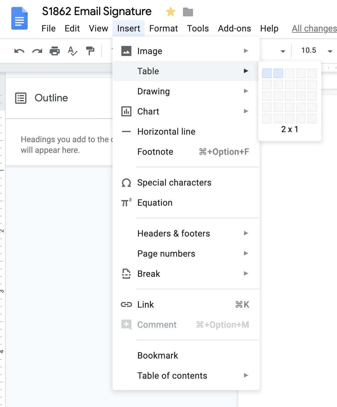 2) Add a table with 2 columns & 1 row (Insert → Table → select 2 blocks, horizontally)