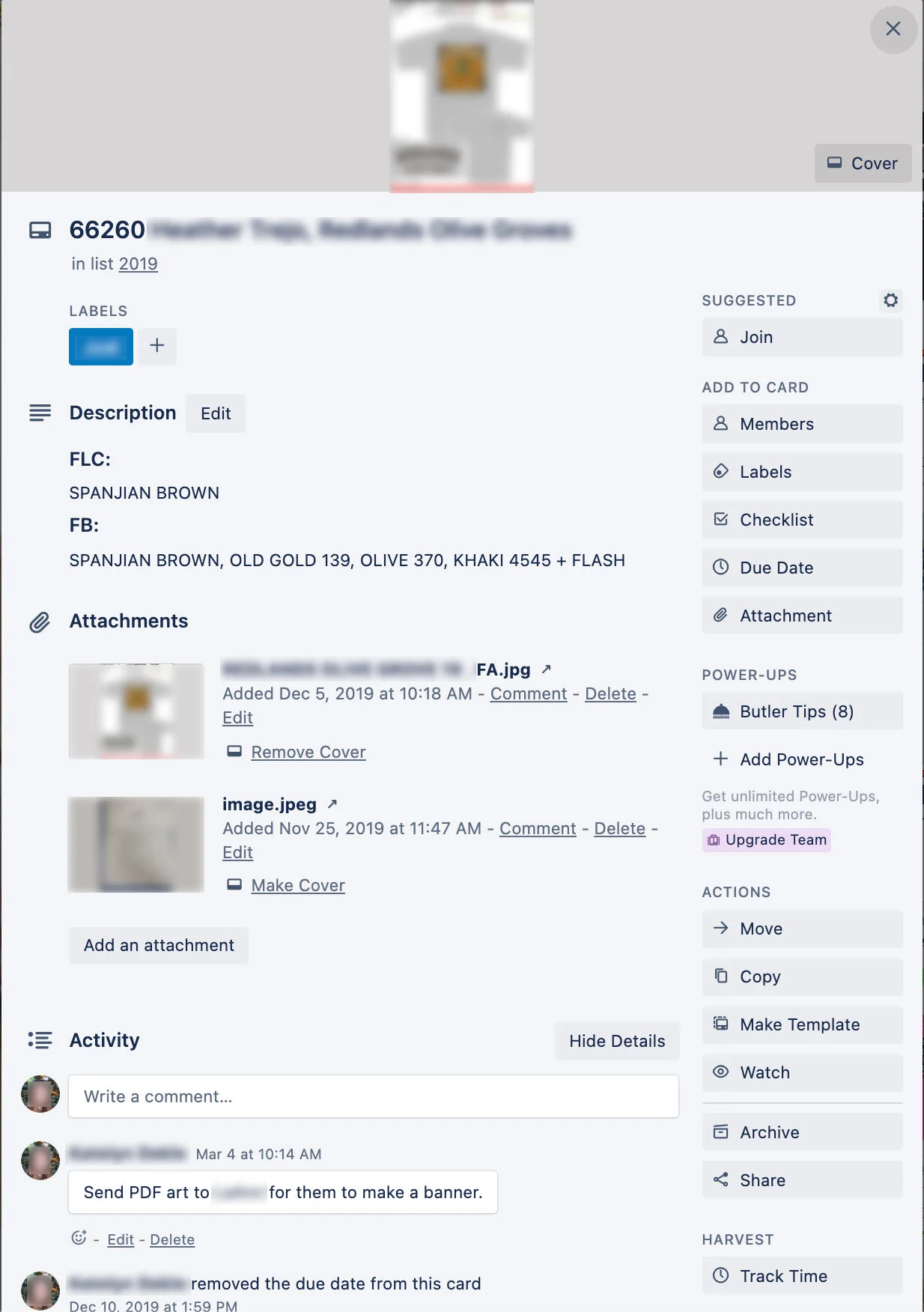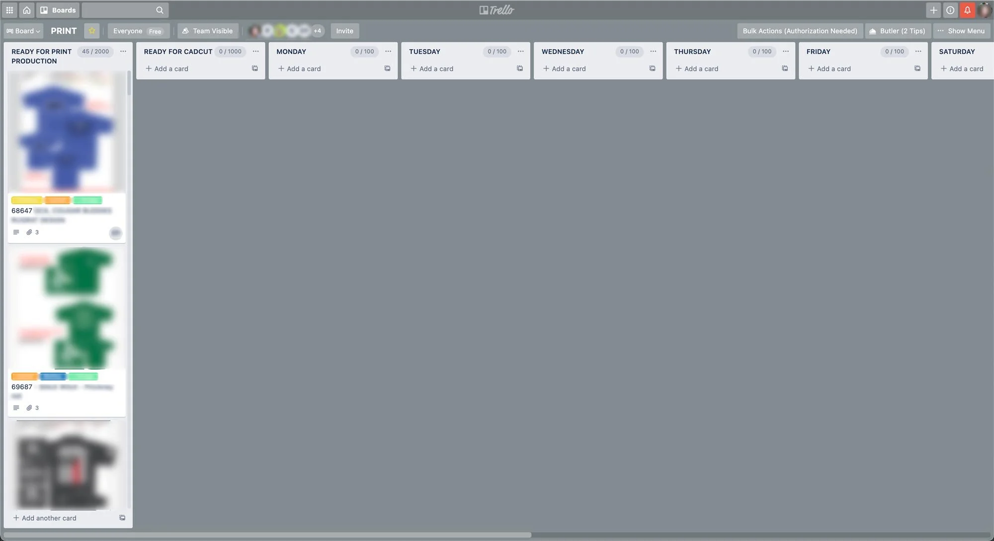 FREE TO USE – Believe it or not, we never had to upgrade to a paid plan in order to use Trello for that business, even though we had 3-4 artists, a board for the print dept, a board for repeats, a board for the embroidery dept and 3-4 additional people with accounts & access privileges to most of the boards in order to see what project is where in the building.