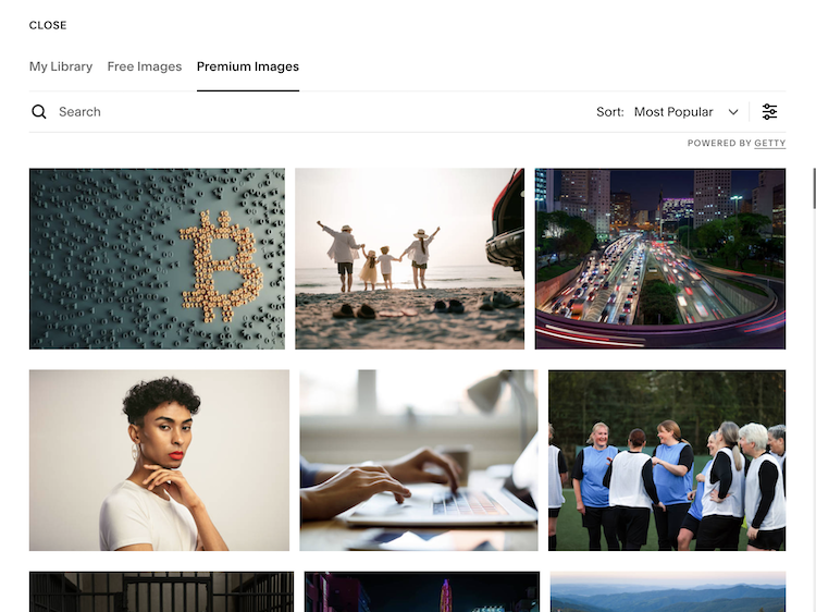 Next you’ll get a pop-up window with 3 tabs across the top center: My Library (your uploads), Free Images (Unsplash), and Premium Images (paid).