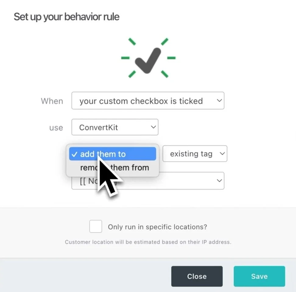 Next, we’ll add a “rule” which will say, ‘when your custom checkbox is ticked, add them to, an existing tag or sequence in ConvertKit.