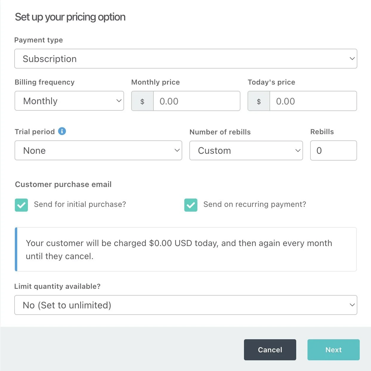 I'm going to set the price for this demo as a one-time fee of $37.00 with no trial period. This “Payment Type” field gives you 3 or 4 options, like
