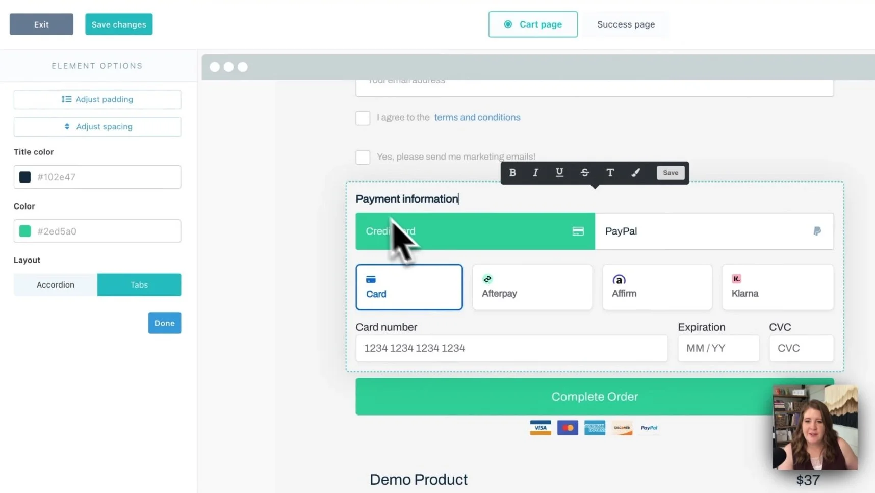 For the payment information, you have two basic design options. You can show them as tabs or show them as an accordion. By default it shows as an accordion with long full-width buttons, but if I switch to tabs (you may have to also save your changes, exit the editor, do a “hard refresh” –that’s Shift + Command/Ctrl + R on your keyboard– and then come back into the editor to see this update) it changes to a more clean/compact tiled look which I personally like better.