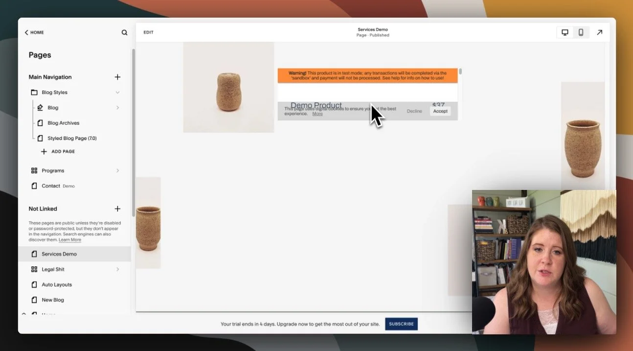 I’ll be using my demo site with very little, if any, custom code or installed plugins, so these screenshots (or what you’d see in the video for this post) should be the closest to what you are looking at in your Squarespace website if you follow along.