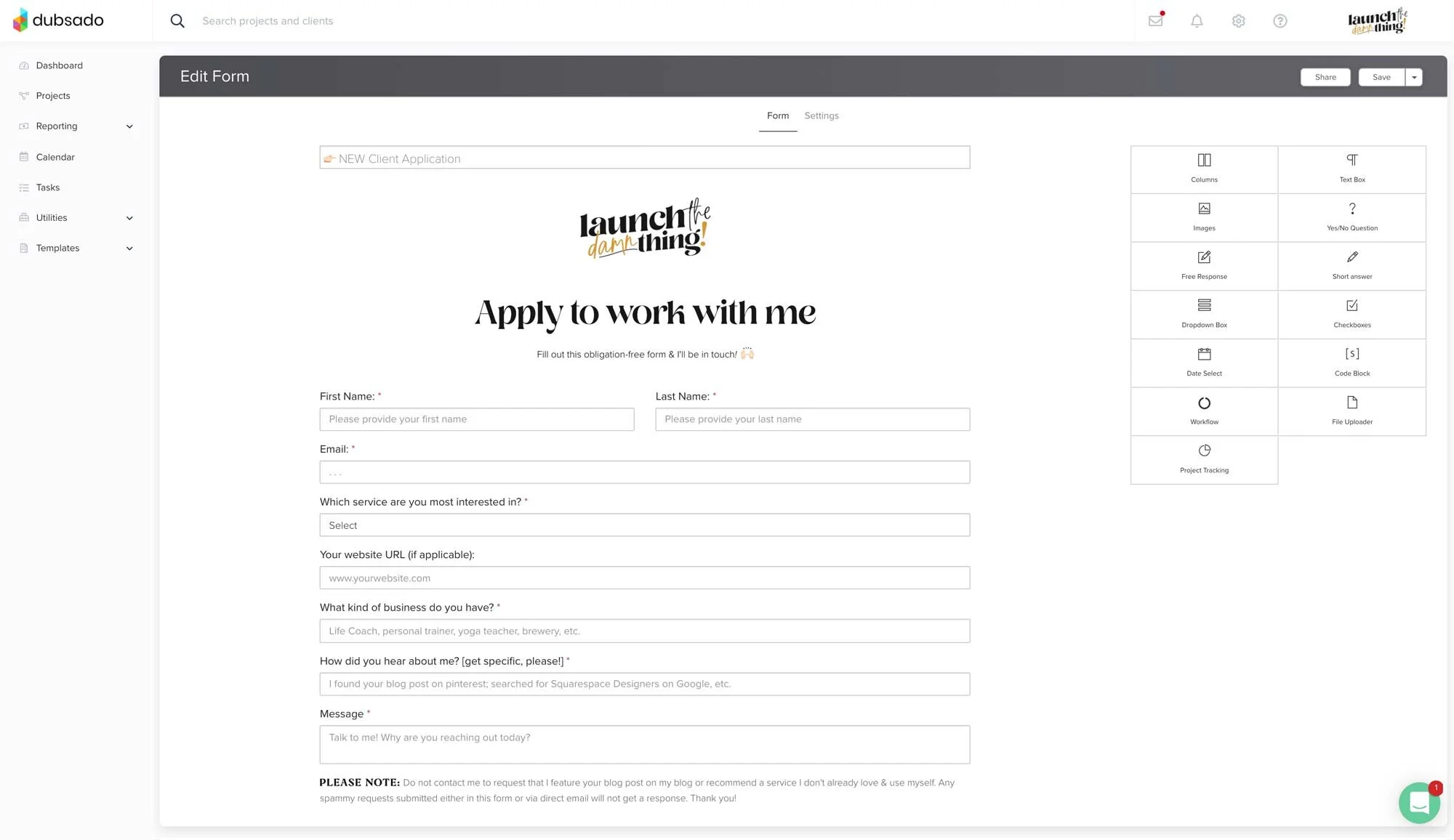Dubsado's forms are all customizable with a powerful drag & drop builder. That means your Proposals, Contracts, Lead Captures, Questionnaires, and other forms can be perfectly on-brand using more than just your logo & brand colors.