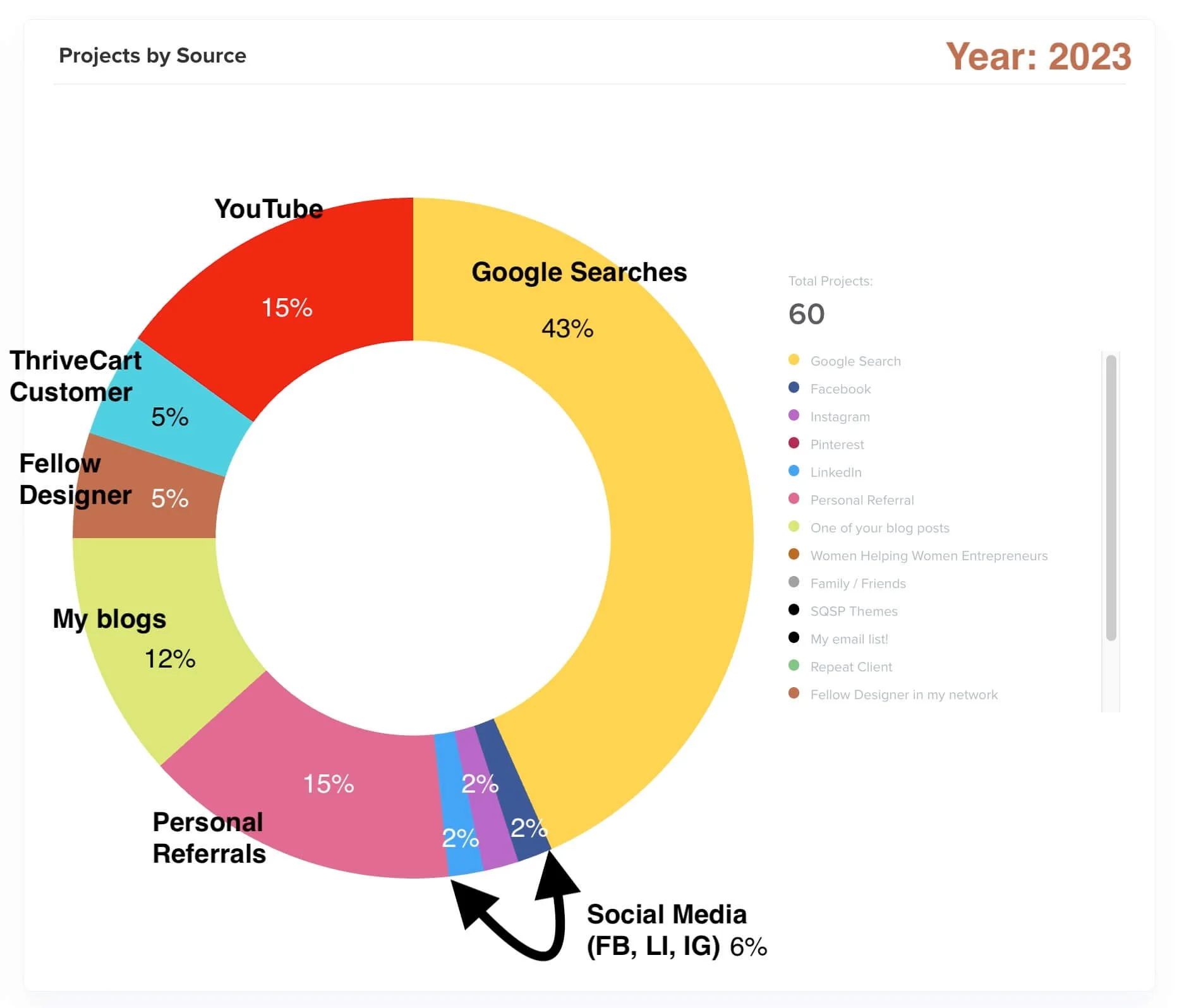 You may be surprised to know that in 2023, of the 60 projects or services I provided, a whopping 43% of those clients found me through Google searches, another 15% discovered me on YouTube, and another 12% found me through specific blog posts.