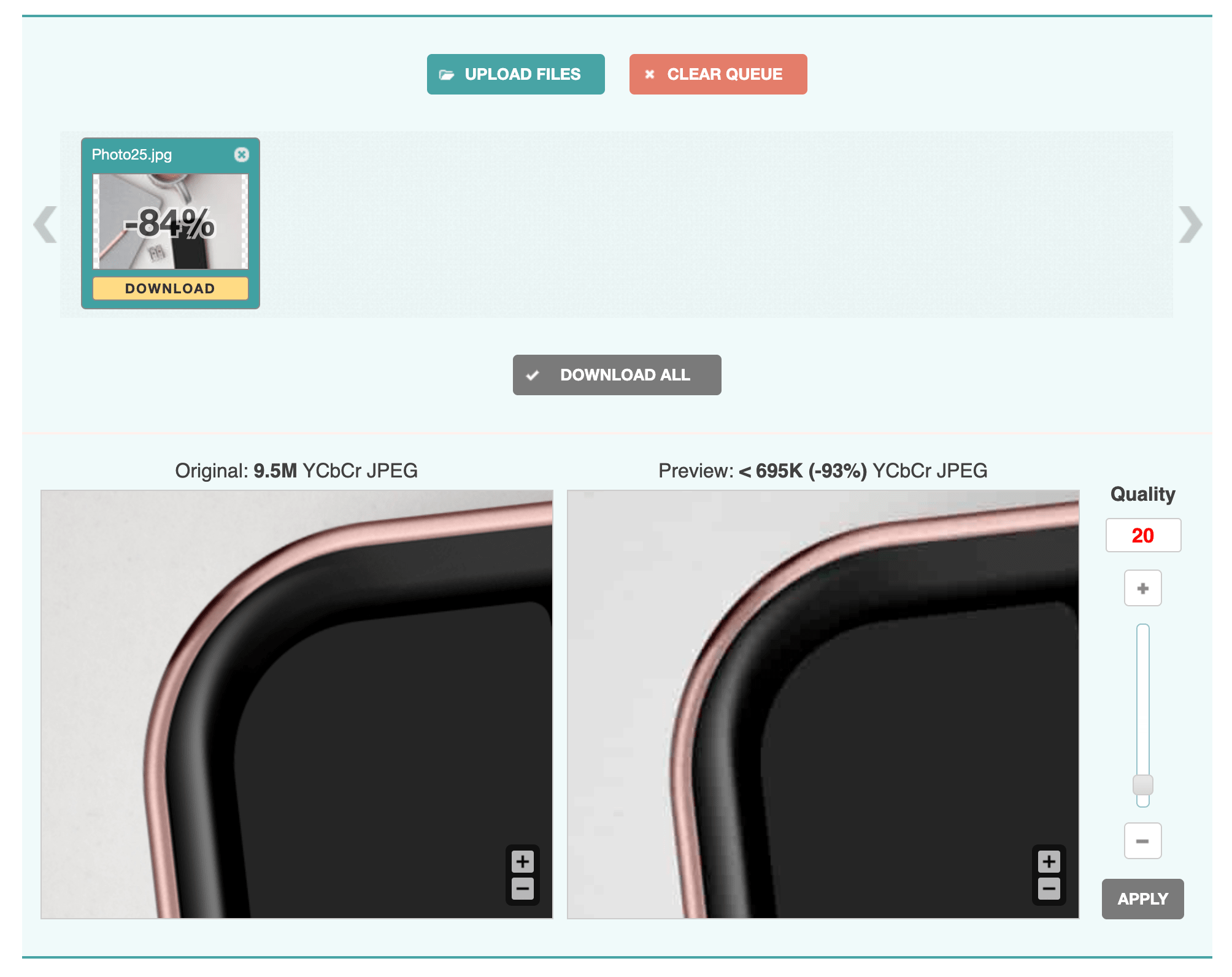 Then go to the online Image Compressor. Upload the photo(s) you want, wait for it to finish uploading, then compressing. When it’s done, scroll down a bit and use the slider to control the quality level.