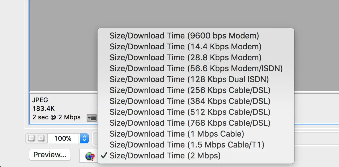That means on a connection of 2 Mbps, the image will load in 2 seconds. If you want to change the speed, click that menu icon to the immediate right of that line of text; you’ll get this pop-up: