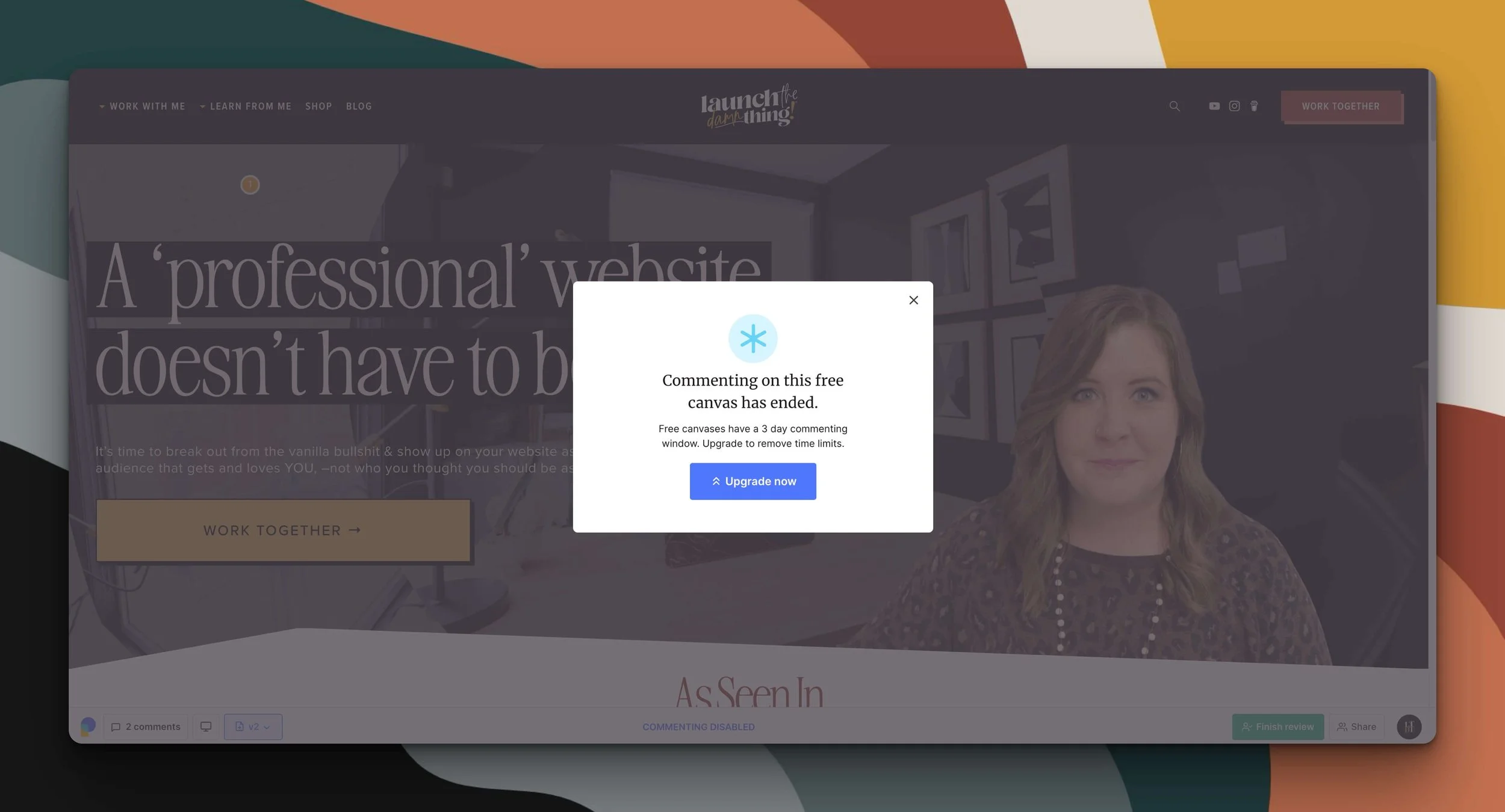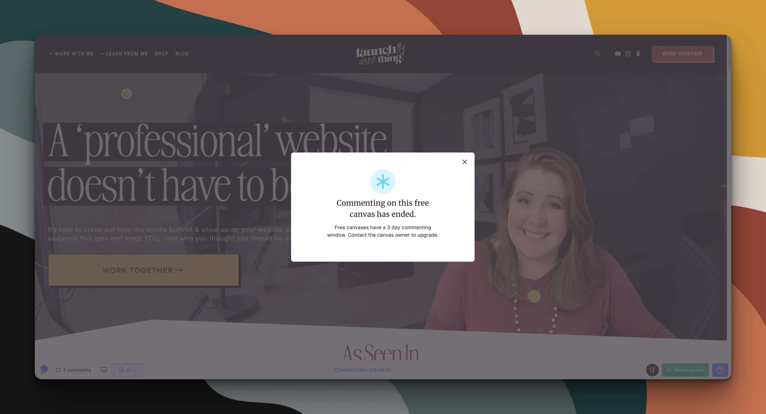 What really impressed me is the simple client experience. When a client opens their shared Canvas link, there's an automatic tutorial that shows them exactly how to use it. YASSS! I don't have to spend 5-10 minutes on a Loom making a tutorial video for how to leave feedback comments. 🙌🏻 There's a popup with clear instructions: "Click anywhere to start leaving feedback. If you need help getting started, click here." And that button triggers a short video tutorial showing them how to use it. So convenient for everyone!