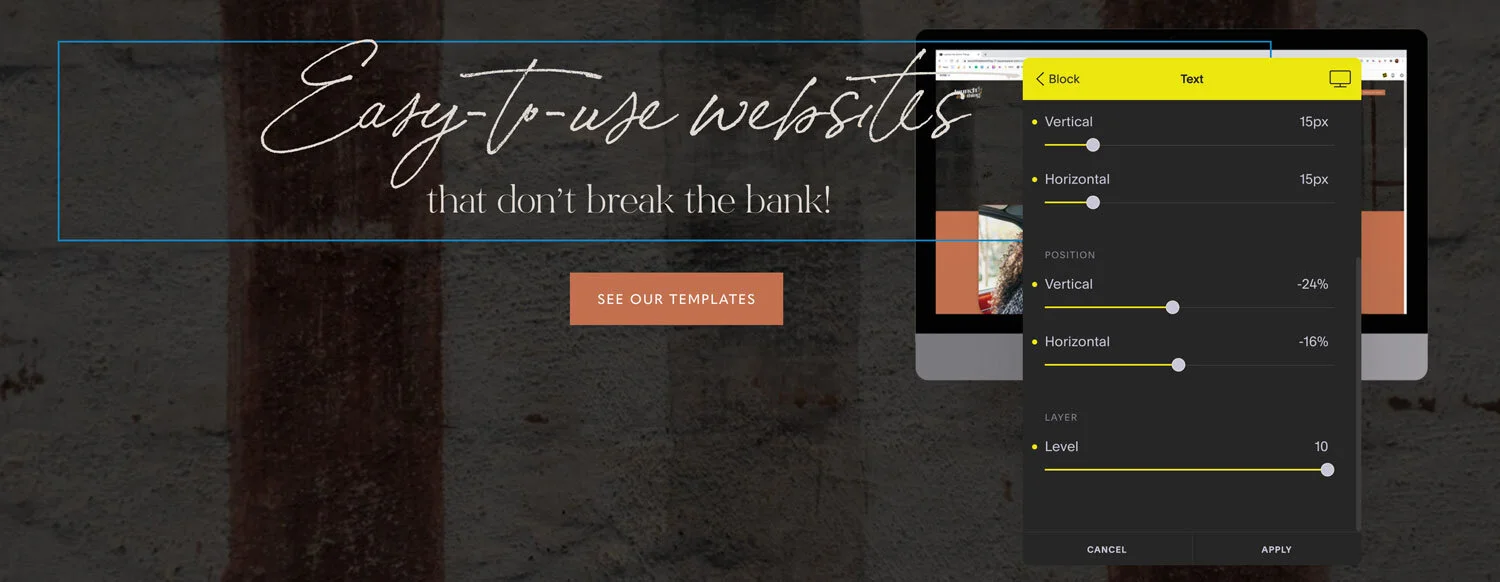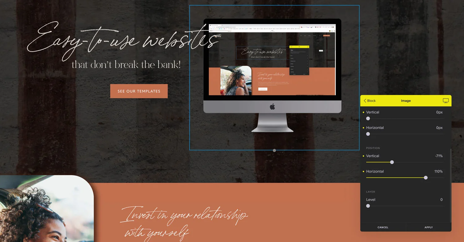 Then I used the level slider for the text block to make sure its # value was higher than the image block, pushing it on top of the image (changing the z-index in the code, which is how it’s typically coded).