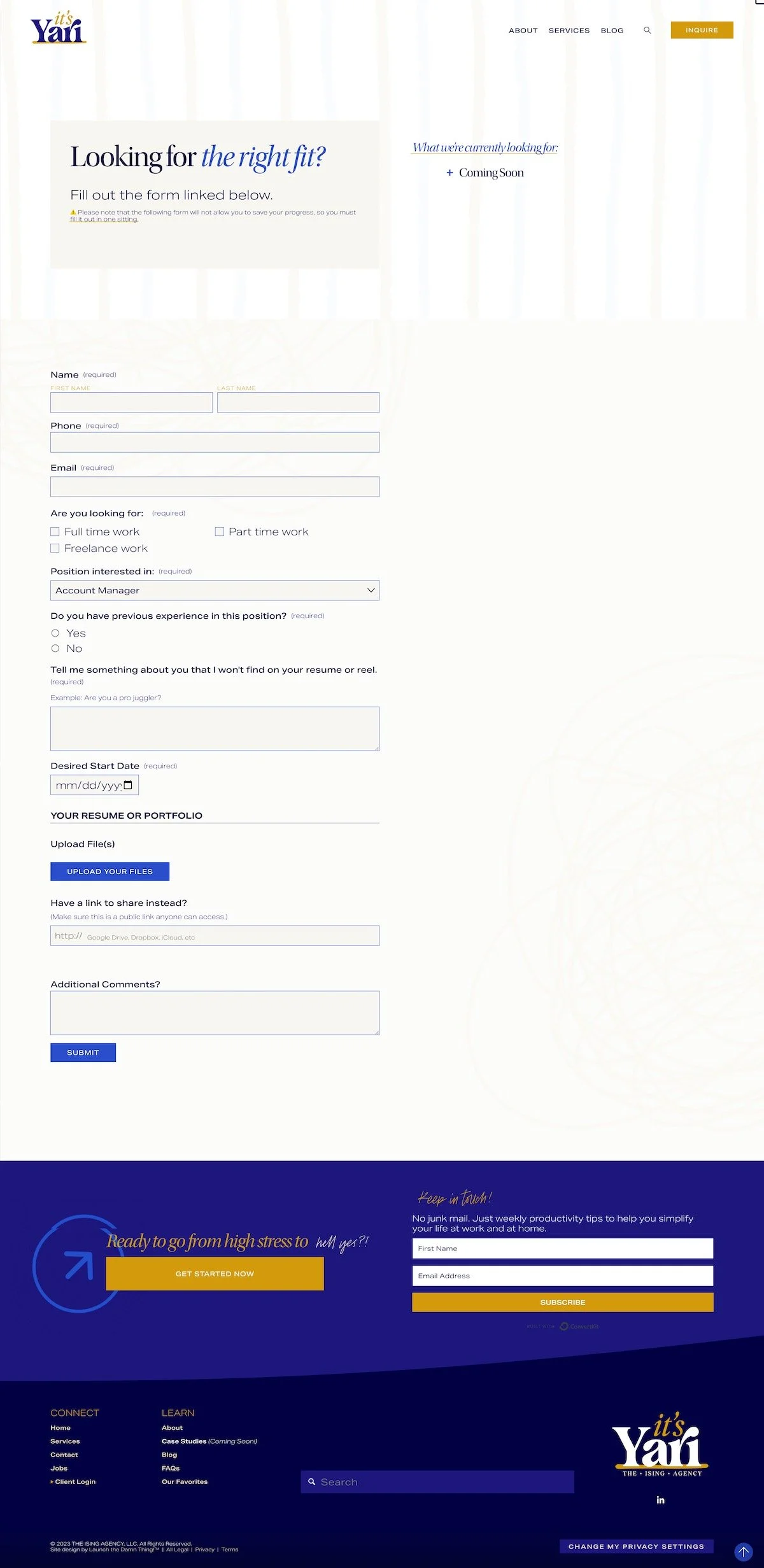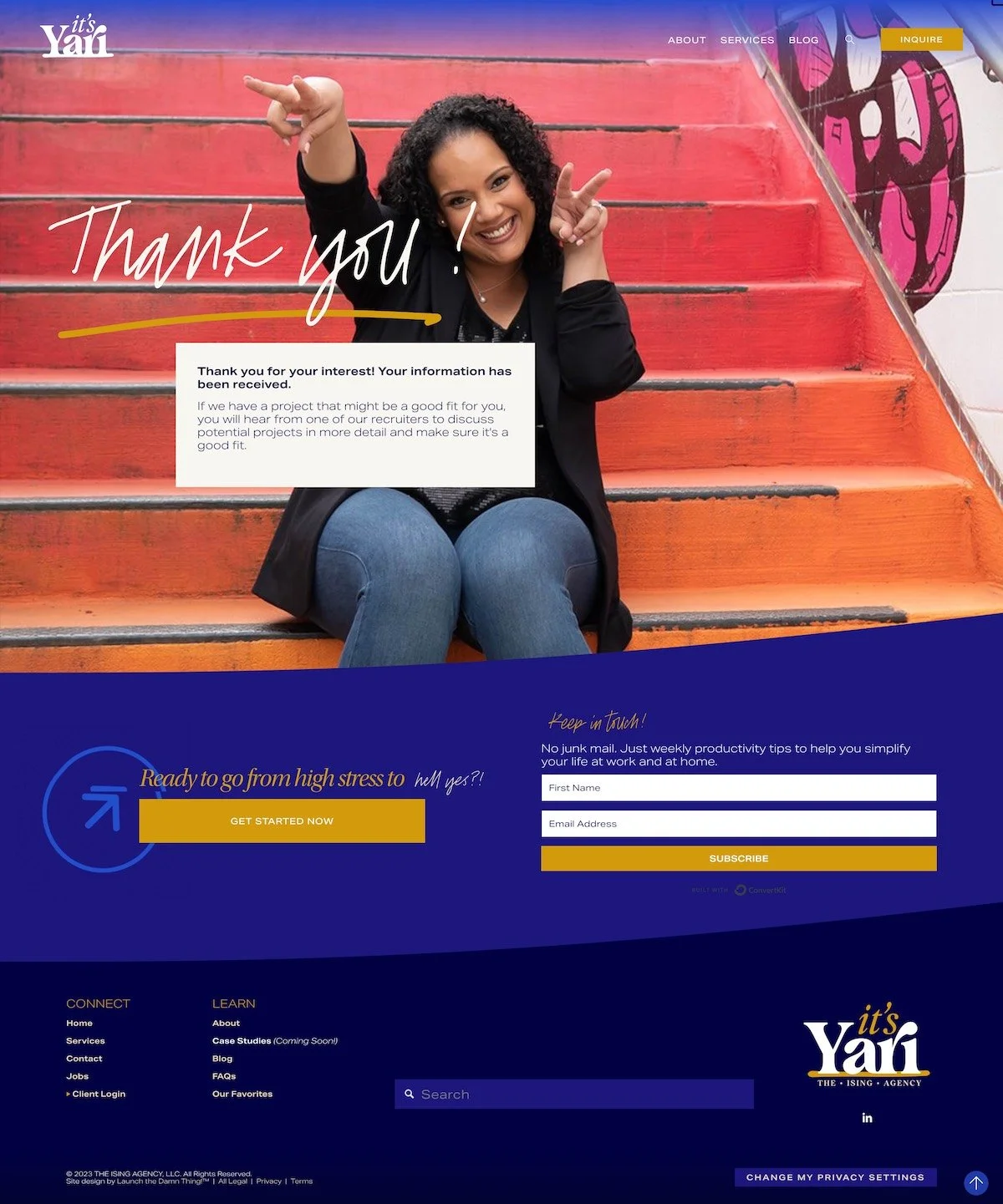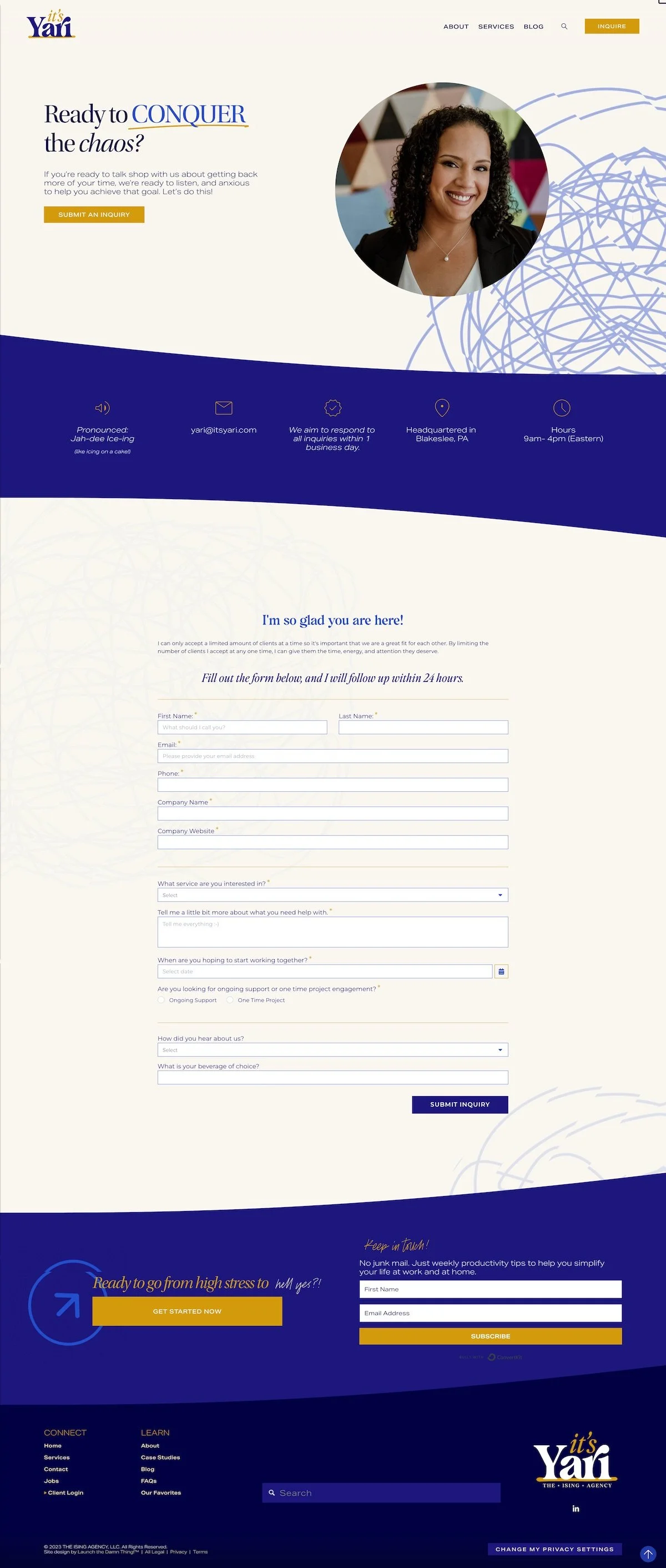 On the contact page, we have a very simple call to action, a button that scrolls down to the form itself, a photo of Yari on a fun, colorful background. We have more mess happening in the background here and a little bit peeking up at the top, like it's going to drop in at any second.
