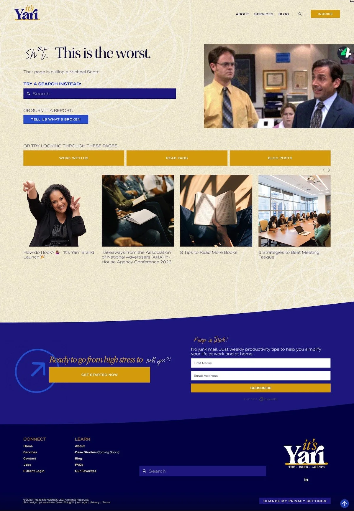 We have kind of a staticky background happening here and something comical to kind of, you know, nod toward the fact that we know if they end up here it's because they didn't wanna be here. So we're trying to make them laugh, but also give them a way to search the website for whatever it was they were looking for, submit a broken link in a form if they want to tell us what's broken, and ways to navigate around the website quickly, places that they may have already been trying to get to.