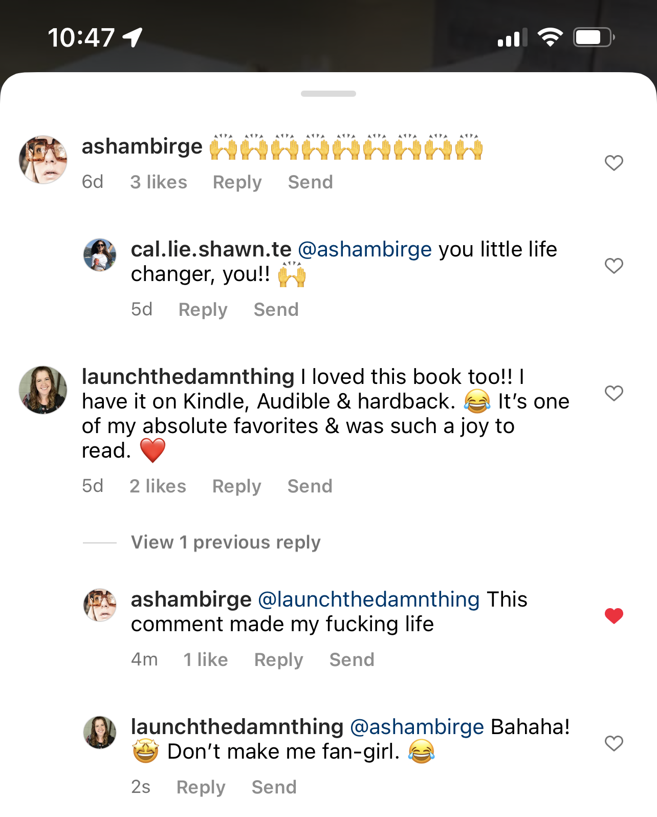 👆🏼 that time when Ash replied to my comment on someone else’s post that mentioned her book. 😳😍🤯 Seriously ––THAT comment “made my f*cking life!” too 😂